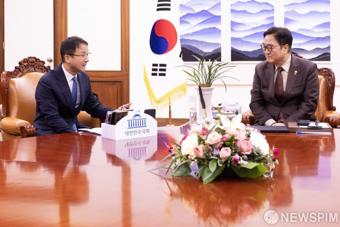 [서울=뉴스핌] 정일구 기자 = 우원식 국회의장(오른쪽)이 12일 오전 서울 여의도 국회 의장실에서 한병도 더불어민주당 신임 원내대표를 접견하고 있다. 2026.01.12 mironj19@newspim.com