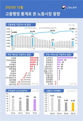 12월 말 기준 고용보험 상시가입자는 1천549만3천명으로, 전년도 같은 달보다 18만 2천명(1.2%) 증가했다.