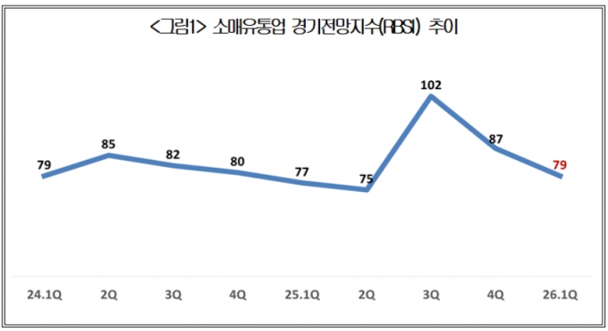 대한상공회의소(대한상의)가 12일 발표한 1분기 소매유통업 경기전망지수(RBSI)조사 결과에 따르면 전망치가 79를 기록했다. RBSI는 유통기업의 경기 판단과 전망을 조사해 지수화한 것으로 기업의 체감경기를 나타낸다. 100 이상이면 '다음 분기의 소매유통업 경기를 지난 분기보다 긍정적으로 보는 기업이 많다'는 의미고 100 미만이면 그 반대다.