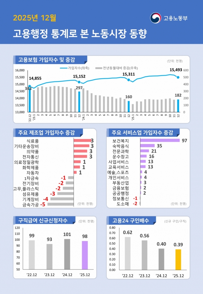 12일 고용노동부가 발표한 '2025년12월 고용행정 통계로 본 노동시장 동향'에 따르면 지난달 고용보험 상시가입자는 1549만3000명으로 전년 대비 18만2000명(1.2%) 증가했다.
