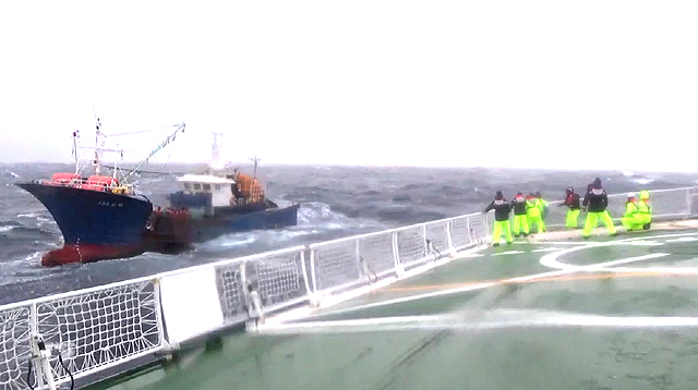 동해해경청이 악천후 속 어선을 예인하고 있다. /동해해경청 |