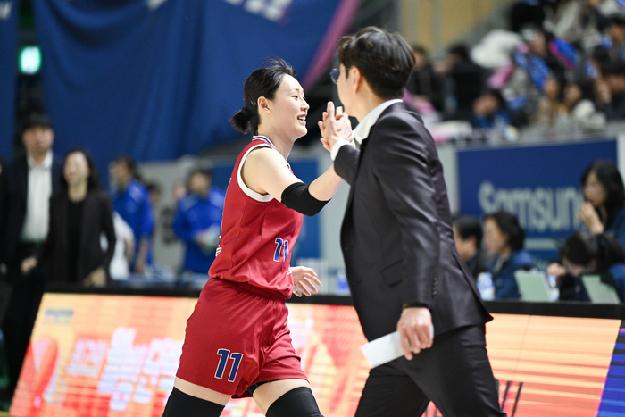 강이슬이 김완수 감독과 하이파이브를 하고 있다. 사진 | WKBL |