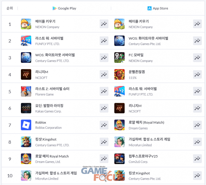 구글 플레이에서는 '메이플 키우기'를 비롯해 '라스트 워: 서바이벌', '화이트아웃 서바이벌', '리니지M', '라스트 Z: 서바이벌 슈터' 등 기존 인기작들이 TOP 5를 그대로 형성하고 있다. 장수 인기 MMORPG로 '오딘: 발할라 라이징'도 이번 주에는 6위로 선전했으며, 이외에 TOP 10은 '킹샷', '로얄 매치', '가십하버' 등 캐주얼 게임들이 채웠다.