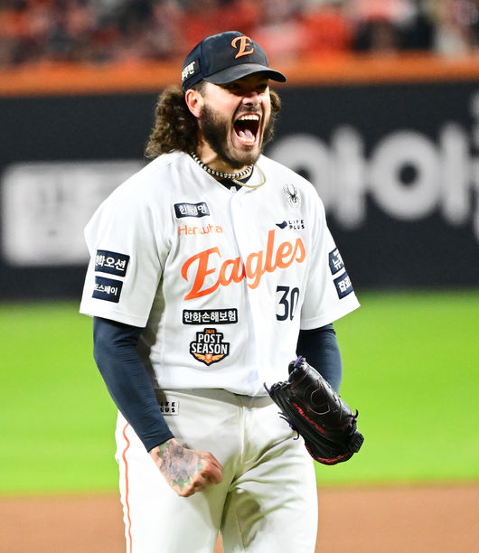 [OSEN=대전, 지형준 기자] 29일 대전시 중구 부사동 대전한화생명볼파크에서 2025 신한 SOL Bank KBO리그 포스트시즌 한국시리즈 3차전 한화 이글스와 LG 트윈스의 경기가 진행됐다.이날 경기에 한화는 폰세를, LG는 손주영을 선발투수로 내세웠다. 6회초 2사 2루에서 한화 폰세가 LG 문보경을 삼진 처리하며 포효하고 있다. 2025.10.29 /jpnews@osen.co.kr |