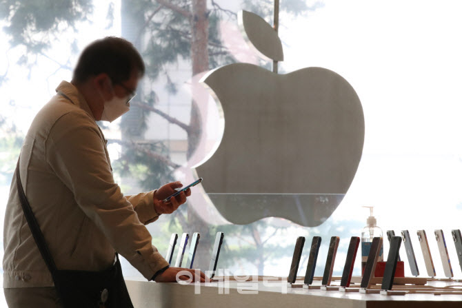 [이데일리 이영훈 기자] 애플스토어 매장에서 고객이 휴대폰을 사용해보고 있다. |