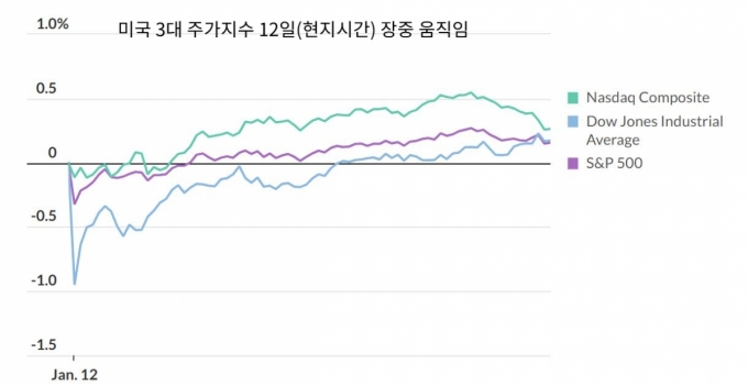 이날 다우존스지수와 S&P500지수는 각각 0.2%씩 오르며 종가 기준 사상최고가를 경신했고 나스닥지수는 0.3% 상승하며 지난해 10월 말 기록했던 사상최고가를 0.9% 남겨두게 됐다.
