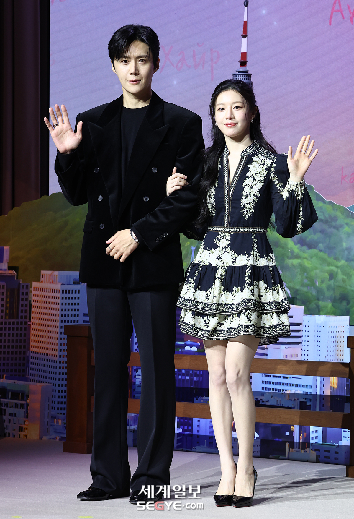 배우 김선호(사진 왼쪽)와 고윤정이 13일 오전 서울 강남구 조선 펠리스 서울 강남에서 열린 넷플릭스 드라마 '이 사랑 통역 되나요?' 제작발표회에 참석해 포즈를 취하고 있다.