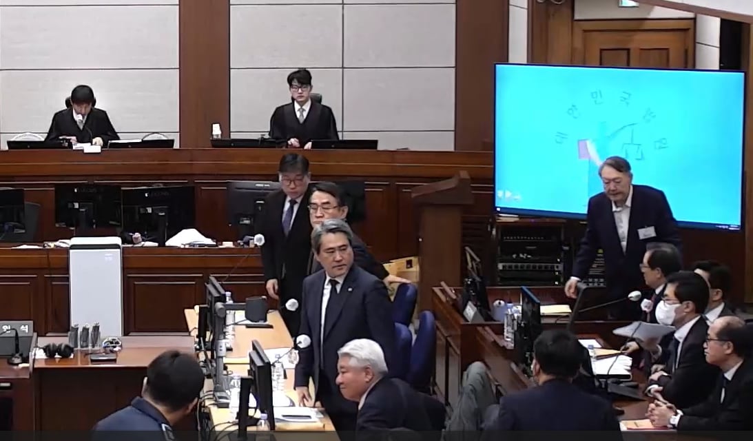 이날 오전 9시 30분에 시작한 재판은 오전 11시 51분 점심 식사 등을 위해 휴정했다. 검은색 양복을 입고 출석한 윤 전 대통령은 지난 9일 1차 결심 공판 때와 달리 변호인들이 준비한 PPT 파일이 나오는 모니터를 응시하며 변론에 집중하는 모습을 보였다.