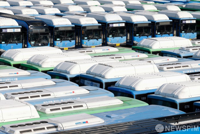 [성남=뉴스핌] 류기찬 기자 = 서울 시내버스가 총파업에 돌입한 13일 오전 서울 송파구 장지공영차고지에 버스들이 주차되어 있다. 서울 시내버스가 파업으로 멈춰 선 것은 2024년 이후 약 2년 만이다. 2026.01.13 ryuchan0925@newspim.com