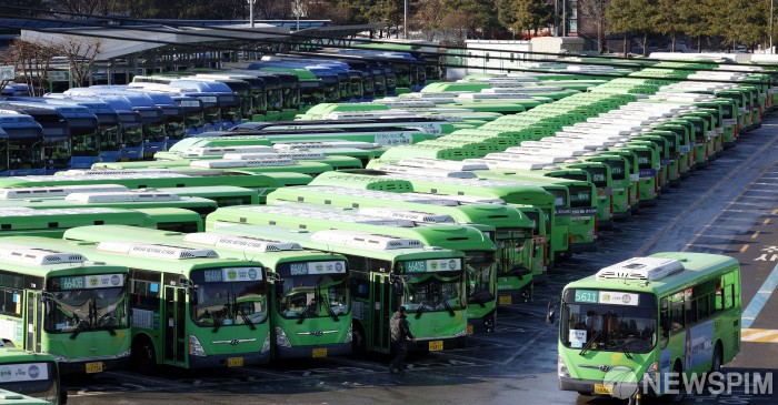 [서울=뉴스핌] 양윤모 기자 = 13일 서울시버스 노사의 임금협상 결렬로 노조가 총파업에 돌입한 가운데, 서울 양천구 공영차고지에 시내버스가 운행을 멈추고 주차되어 있다. 서울시내버스는 64개사 394개 노선에서 7천382대가 운행 중이다. 2026.01.13 yym58@newspim