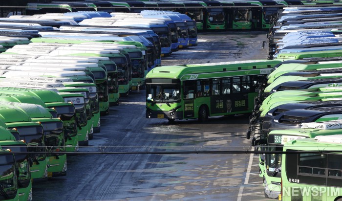 [서울=뉴스핌] 양윤모 기자 = 13일 서울시버스 노사의 임금협상 결렬로 노조가 총파업에 돌입한 가운데, 서울 양천구 공영차고지에 시내버스가 운행을 멈추고 주차되어 있다. 서울시내버스는 64개사 394개 노선에서 7천382대가 운행 중이다. 2026.01.13 yym58@newspim |