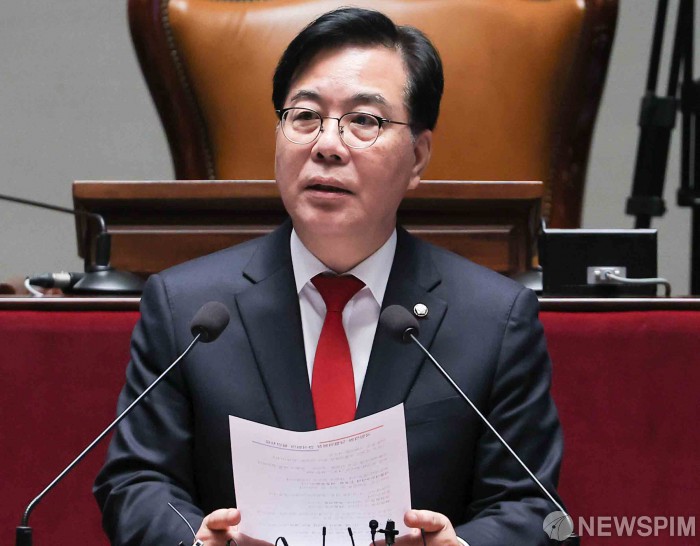 [서울=뉴스핌] 윤창빈 기자 = 송언석 국민의힘 원내대표가 13일 서울 여의도 국회에서 열린 국회의원-당협위원장 연석회의 및 의원총회에서 모두발언을 하고 있다. 2026.01.13 pangbin@newspim.com