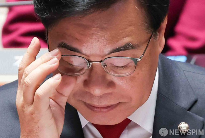 [서울=뉴스핌] 윤창빈 기자 = 송언석 국민의힘 원내대표가 13일 서울 여의도 국회에서 열린 국회의원-당협위원장 연석회의 및 의원총회에서 안경을 고쳐쓰고 있다. 2026.01.13 pangbin@newspim.com