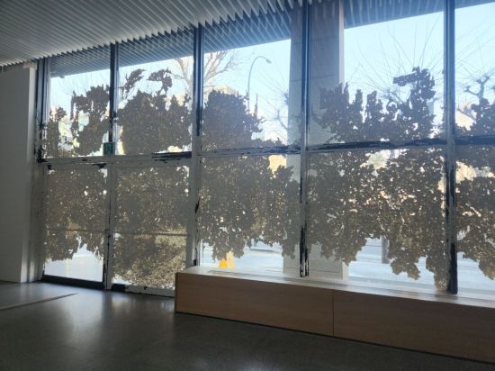 최선아(27)의 '진지바'(2026)는 14m에 달하는 로비 유리 공간에 스컬피(점토)를 붙인 작품이다. 점토 자체의 점성을 활용해 작가가 3주에 걸쳐 손으로 하나하나 눌러 완성했다. 특별한 상징이나 명확한 의미를 전면에 내세우기보다는, 시간대에 따라 햇빛과 만들어내는 서로 다른 표면의 변화가 색다른 아름다움으로 시선을 끈다.