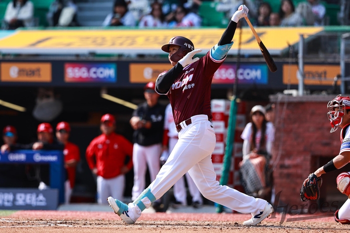 키움 시절 김동엽이 14일 인천SSG랜더스필드에서 열린 2025 KBO리그 시범경기 SSG전에서 홈런을 터뜨리고 있다. 사진 | 키움 히어로즈 |