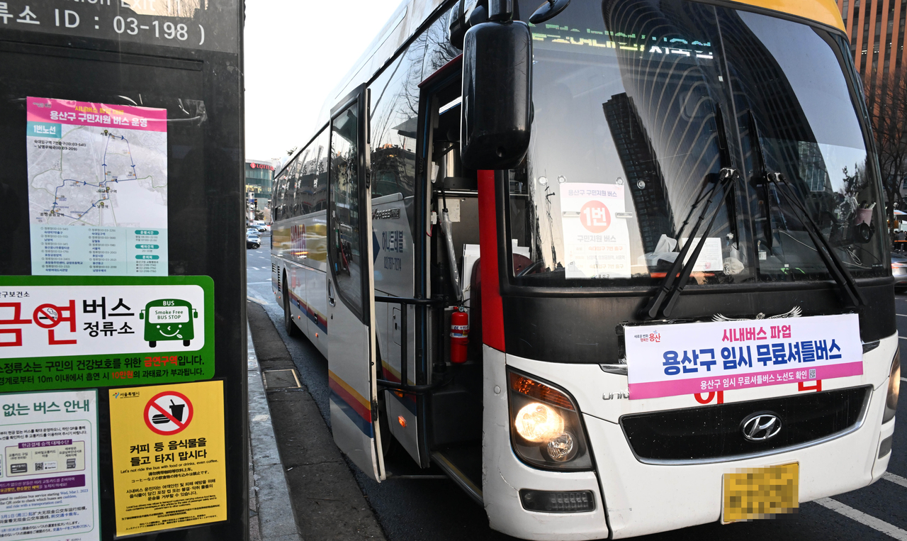 서울시시내버스노동조합이 무기한 전면파업에 돌입한지 이틀째인 14일 오전 서울시의 한 버스정류장에 임시 무료셔틀버스가 승객을 기다리고 있다. 이상섭 기자 |