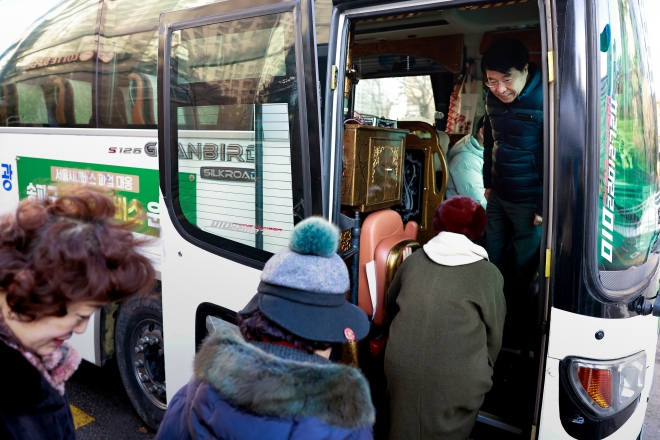 서강석(맨 오른쪽) 송파구청장이 13일 오후 서울시내버스 파업으로 구에서 운영하는 무료 셔틀버스에 탑승해 주민들에게 안내를 하고 있다. 송파구 제공 |