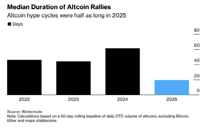 윈터뮤트 분석 "작년 알트코인 랠리 평균 20일로 짧아져"
