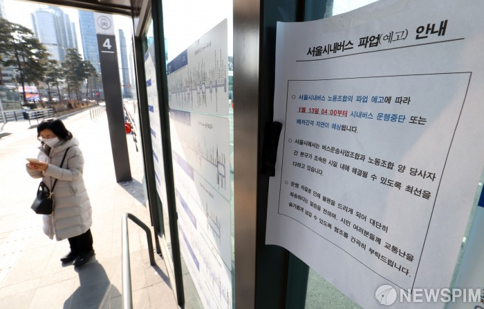 [서울=뉴스핌] 정일구 기자 = 서울 시내버스 파업이 이틀째 이어진 14일 오전 서울 중구 서울역버스종합환승센터에서 한 시민이 버스를 기다리고 있다. 2026.01.14 mironj19@newspim.com