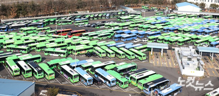 서울 시내버스 파업 이틀째인 14일 서울 한 버스공영차고지에 서울 시내 버스들이 주차돼 있다.