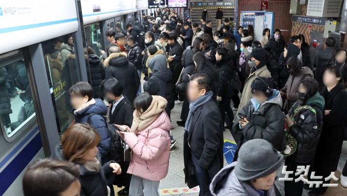 서울 시내버스 파업 이틀째인 14일 서울 지하철 1호선 서울역 승강장이 승객들로 붐비고 있다.