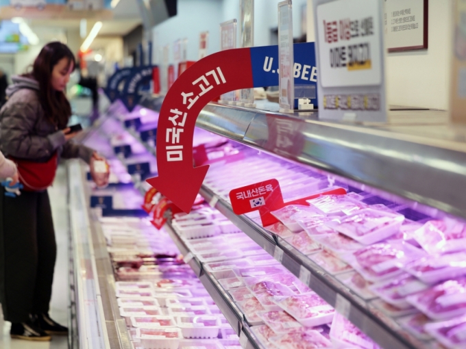 14일 서울시내 한 대형마트의 미국산 소고기 판매대에서 고객이 상품을 살펴보고 있다. /사진=뉴스1 |