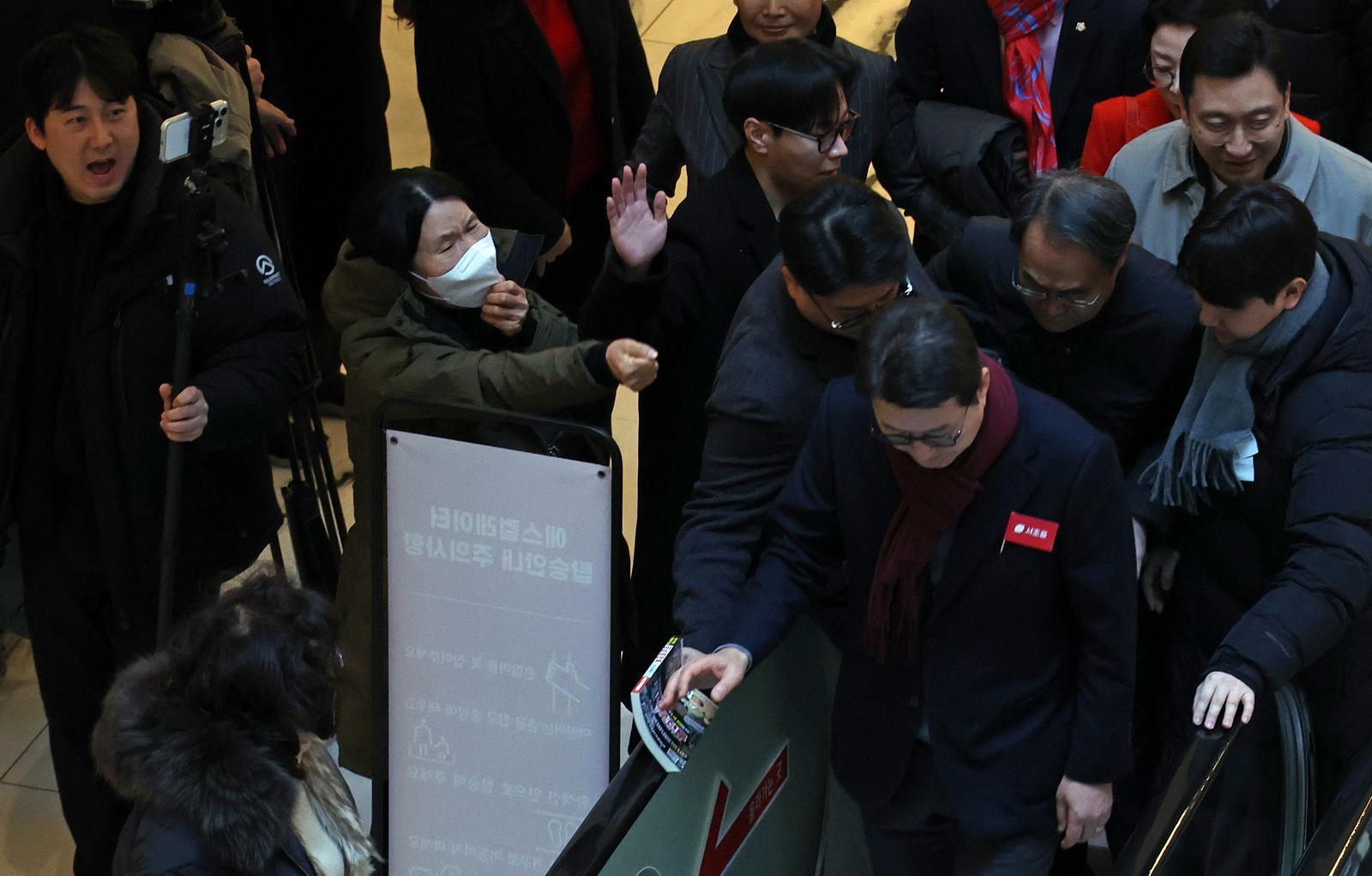 제명 항의하는 韓지지자들 국민의힘 한동훈 전 대표의 지지자들이 14일 오전 국민의힘 서울시당 신년인사회가 열린 서울 영등포구 중소기업중앙회에서 신동욱 최고위원(오른쪽 아래)에게 항의하고 있다. 당 중앙윤리위원회는 이날 새벽 ‘당원게시판 사건’과 관련해 한 전 대표에 대한 제명 처분을 의결했다. 뉴시스 |