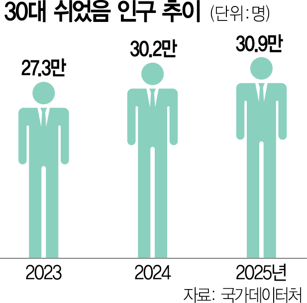 더욱 큰 문제는 구직 활동을 단념하고 노동시장 밖으로 밀려난 이른바 ‘쉬었음’ 인구가 청년층에서 급증하고 있다는 점이다. 지난해 연간 기준 30대 쉬었음 인구는 30만 9000명으로 관련 통계를 작성하기 시작한 2003년 이후 가장 높은 수준이다. 2023년 27만 3000명, 2024년 30만 2000명, 2025년 30만 9000명으로 꾸준히 늘고 있다. 지난해 20대(20~29세) 쉬었음 인구도 40만 8000명을 기록해 2030세대에서만 71만 7000명에 달한다. 이 역시 관련 통계 작성 이후 처음으로 70만 명을 넘어섰다. ‘쉬었음’은 취업 준비, 가사, 육아 등 구체적인 이유 없이 구직 활동을 하지 않는 상태를 의미한다. 이들은 노동시장 밖으로 내몰려 사실상 정부의 각종 지원 정책에서도 소외된 실정이다.