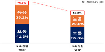 분석 결과에 따르면 창업 교육을 받아본 미취업 청년(392명) 중 향후 창업 의향을 ‘높음’으로 응답한 비율은 35.2%였다. 교육 경험이 없는 청년(22.6%)과 비교했을 때 1.6배가량 높은 수준이다. 창업 의향이 ‘보통’인 응답까지 고려할 경우 교육 경험이 있는 미취업 청년 4명 중 3명(76.5%)은 창업 가능성을 배제하지 않는 것으로 나타났다.