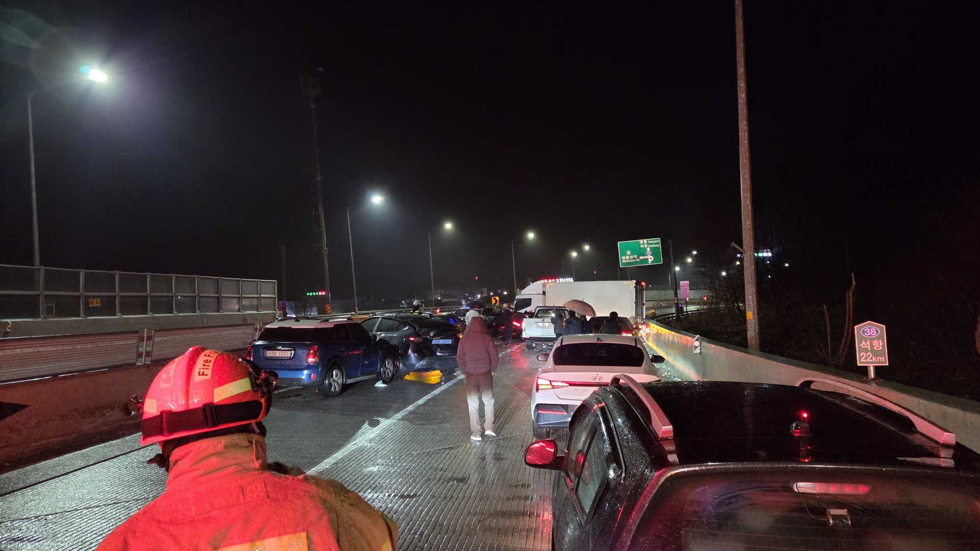 사고 수습 과정에서 뒤따르던 차량 5대가 서행을 유도하며 교통정리를 하던 경찰차를 잇달아 들이받으면서 44세 남성이 크게 다쳤습니다.