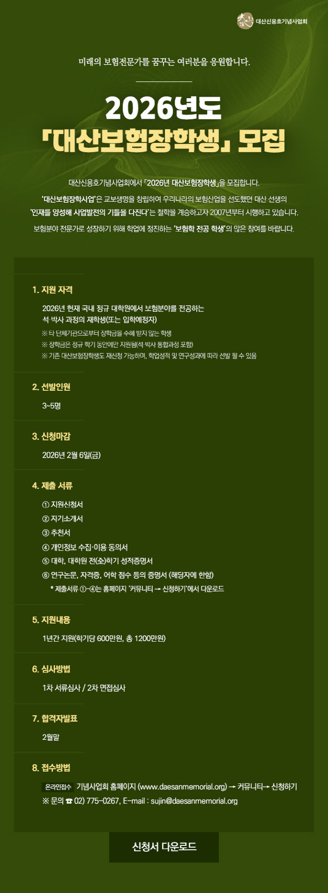 남궁훈 대산신용호기념사업회 이사장은 “AI와 디지털 기술로 금융 환경이 급변하고 있지만 우리 보험 산업이 지속 성장할 수 있도록 대산 신용호 선생의 철학을 이어받아 미래 보험 전문가 육성의 든든한 버팀목이 되겠다”며 “대한민국 보험 산업의 내일을 설계할 우수한 학생들의 많은 지원을 바란다”고 말했다.