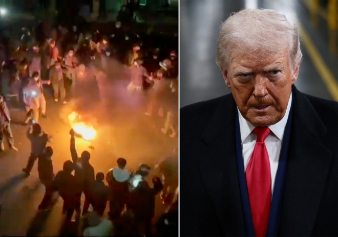 보안·통신 차단 속에 이란 테헤란에서 반정부 시위가 이어지는 가운데 불길이 치솟는 시위 현장(왼쪽)과, 13일(현지시간) 미시간주 디어본의 포드 자동차 생산시설을 찾은 도널드 트럼프 미국 대통령(오른쪽). AP·로이터 연합뉴스 |