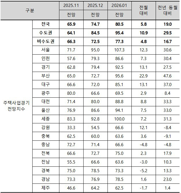 2026년 1월 전국 주택사업경기전망지수. (사진=주택산업연구원 제공) |