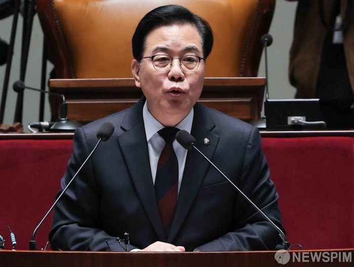 [서울=뉴스핌] 윤창빈 기자 = 송언석 국민의힘 원내대표가 15일 서울 여의도 국회에서 열린 의원총회에서 모두발언을 하고 있다. 2026.01.15 pangbin@newspim.com