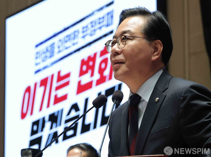 [서울=뉴스핌] 윤창빈 기자 = 송언석 국민의힘 원내대표가 15일 서울 여의도 국회에서 열린 의원총회에서 모두발언을 하고 있다. 2026.01.15 pangbin@newspim.com