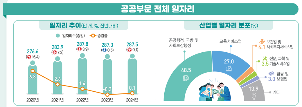 공공부문 일자리는 코로나19 시기인 2020년 6.3%의 증가율을 보였으며 2021년에는 2.6%, 2022년에는 1.4% 늘어났다. 하지만 2023년에는 통계 작성 이래 처음으로 0.2%의 감소율을 보였다. 코로나19 시기 공공 일자리 확대 정책으로 늘어난 뒤 조정을 거치는 과정으로 분석된다.
