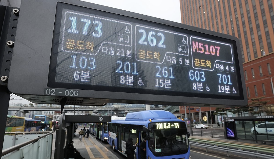 서울 시내버스 노사의 임금·단체협약 협상이 파업 이틀 만에 타결된 다음 날인 15일 서울역버스환승센터에 시내버스 도착 정보가 표시돼 있다. 연합뉴스. |