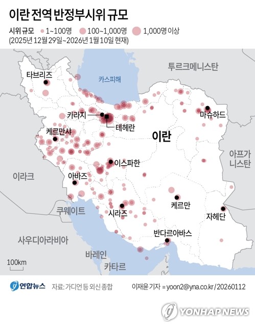 [그래픽] 이란 전역 반정부시위 규모 |