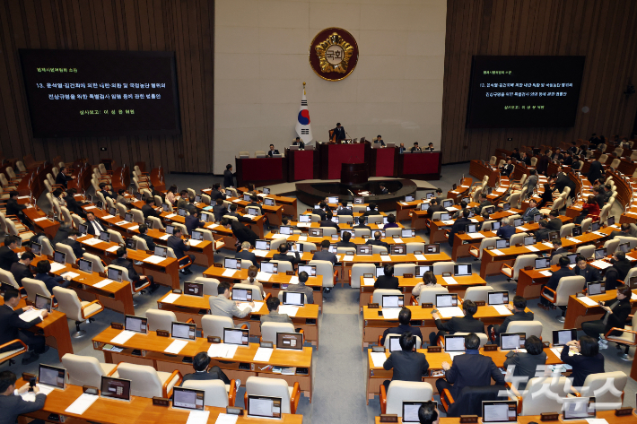 15일 서울 여의도 국회 본회의에 윤석열·김건희에 의한 내란·외환 및 국정농단 행위의 진상규명을 위한 특별검사 임명 등에 관한 법률안이 보고되고 있다. 윤창원 기자 |