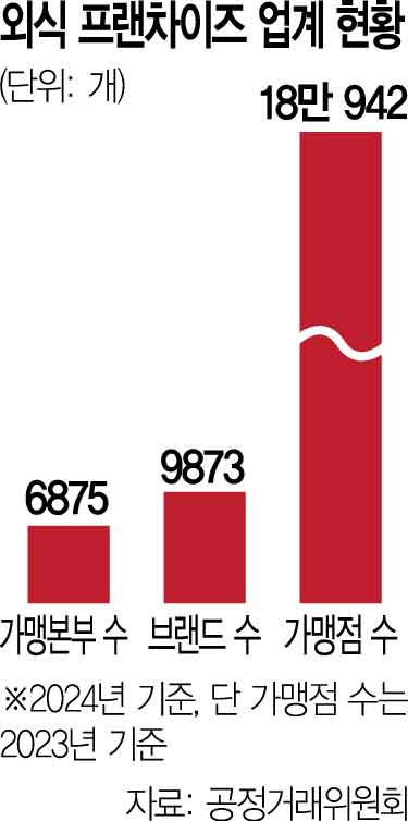이미 성장 둔화 국면에 접어든 업계 흐름에 법·제도 리스크까지 더해지며 가맹본부들의 부담은 더 커질 수 있다는 관측이 나온다. 내수 침체와 소비 위축이 장기화되면서 프랜차이즈 산업의 외형 성장세는 매년 감소하는 추세다. 공정거래위원회에 따르면 외식 프랜차이즈 가맹점 수는 2021년 16만 7455개에서 2022년 17만 9923개, 2023년 18만 942개로 증가했지만 증가 폭은 23.9%, 7.4%, 0.6%로 둔화되고 있다. 통계청이 집계한 프랜차이즈 업종별 매출 증가율도 2022년 18.2%에서 2023년 8.4%, 2024년 6.8%로 해마다 하락하고 있다.