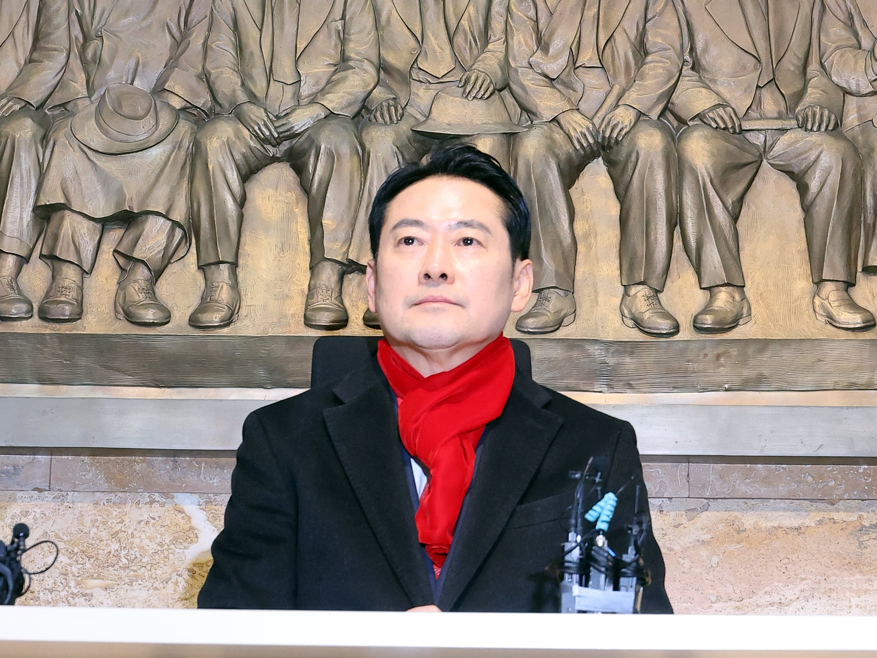 장동혁, 제헌국회 의원상 앞에서 단식농성 국민의힘 장동혁(가운데) 대표가 15일 더불어민주당의 통일교·공천 헌금 특검 수용을 요구하며 국회 중앙홀에 있는 제헌국회 의원 조형물 앞에서 단식 농성을 하고 있다. 왼쪽부터 국민의힘 이인선·김대식 의원, 장 대표, 송언석 원내대표, 박대출 의원./김지호 기자 |