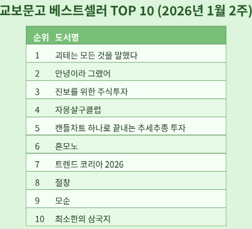 소설에 대한 독자들의 관심도 이어지고 있다. 김애란의 ‘안녕이라 그랬어’가 종합 2위로 뒤를 이었다. 한로로의 ‘자몽살구클럽’과 성해나의 ‘혼모노’도 각각 종합 4위, 6위로 순위가 상승하며 꾸준한 사랑을 받고 있다. 2026년에도 양귀자의 ‘모순’은 9위를 차지하며 스테디셀러의 저력을 이어갔고, ‘나는 소망한다 내게 금지된 것을’ 역시 관심이 재점화되며 12계단 오른 종합 56위를 기록했다.