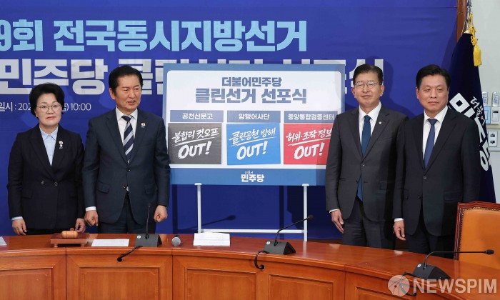 [서울=뉴스핌] 윤창빈 기자 = 정청래 더불어민주당 대표 등 참석자들이 16일 서울 여의도 국회에서 열린 제9회 전국동시지방선거 클린선거 선포식에서 기념촬영을 하고 있다. 왼쪽부터 권향엽 공천신문고 단장, 정 당대표, 이상식 클린선거암행어사단장, 조승래 사무총장. 2026.01.16 pangbin@newspim.com |