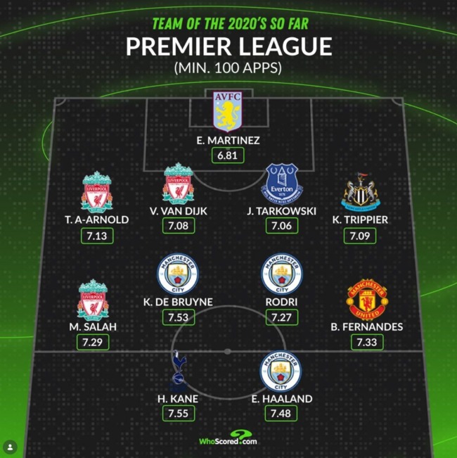 축구 통계 매체 '후스코어드닷컴'은 15일(한국시간) 공식 SNS를 통해 2020년대 프리미어리그 베스트 일레븐을 공개했다. 최소 100경기 이상은 뛰었던 선수들을 대상으로 했다.