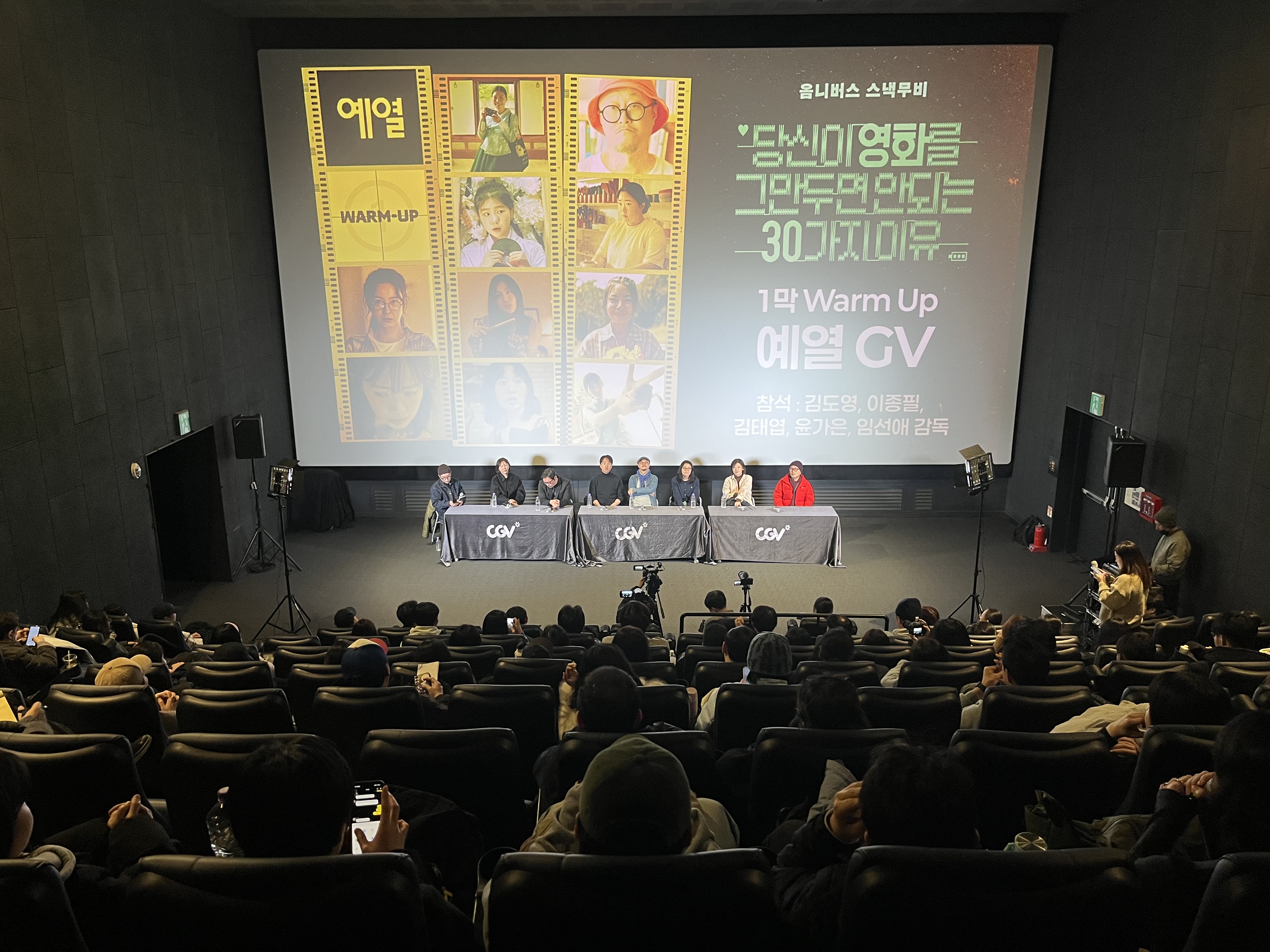 한국영화의 과거부터 현재, 미래를 책임질 주목받는 30인의 감독이 3분씩 선보이는 30개의 흥미로운 이야기를 3막의 영화로 엮은 옴니버스 스낵무비 <당신이 영화를 그만두면 안 되는 30가지 이유>의 1막 '예열'이 지난 1월 14일 개봉해 극장가에 신선한 활력을 불어넣고 있다. 특히 지난 1월 14일(수) CGV용산아이파크몰에서 열린 GV에는 <엎어질 조짐>의 김도영 감독, <꿩>의 이종필 감독, <30번째 환생한 남자>의 김태엽 감독과 배우 김덥, <만감이 교차한다>의 윤가은 감독, <껌이지>의 임선애 감독과 배우 기주봉이 참석해 현장을 뜨겁게 달궜다. 김도영 감독은 "처음 생각한 건 남자 감독과 여자 스타의 이야기였고, 제 주변에 가장 유명한 스타인 정유미에게 출연을 제안했다. 그런데 정유미 씨가 감독 캐릭터를 하고 싶다고 해서, 제작자 역으로 조윤희 배우를 모셔 재미있게 찍었다"라며 <82년생 김지영>에 이어 <엎어질 조짐>을 통해 정유미와 다시 한번 합을 맞추게 된 과정을 전했다. 이종필 감독은 '<꿩>의 주인공들은 왜 화장실을 30m 앞에 두고 가지 못했을까?'라는 관객의 질문에 "화장실을 30m 앞에 두고, 30m를 못 가서 멈춰 있는 순간인 것이다. <당신이 영화를 그만두면 안 되는 30가지 이유>의 테마가 30이기도 해서, 30m를 앞두고 위기에 빠진 두 사람으로 그렸다. 실제로 영화 때문에 고생하던 시절에 실제 경험이 담겨있기도 하다"라는 재치 있는 답변을 내놓아 현장을 웃음바다로 만들기도 했다. 김태엽 감독은 "김덥과 함께 게임을 하던 중 이 프로젝트의 제안 연락을 받았다. '나를 광인으로 캐스팅해가지고, 니가 레오 카락스하고 내가 드니 라방 하고. 하나 만들면 안 되나?'라는 김덥의 말에 재미있을 것 같아 참여하게 되었다"라며 이번 프로젝트에 참여하게 된 비하인드를 공개했다. 김덥 배우는 "시나리오를 보니 원래 제가 생각하던 것, 하는 말들과 좀 비슷했다. 그래서 같이 놀듯이 하게 됐다. 현장에서 내 마음대로 해도 무조건 좋다고 해줬다" 라며 김태엽 감독과의 찰떡 호흡을 자랑했다.