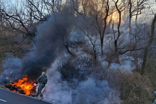 (포항=연합뉴스) 손대성 기자 = 해병대 부사관이 야산 주변에서 난 불을 조기에 진압해 큰 불로 번지지 않도록 막았다.