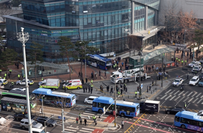 16일 오후 서울 서대문구 서대문역사거리에서 버스가 인도로 돌진한 사고가 발생해 경찰과 소방당국이 현장 수습을 하고 있다./사진=뉴시스. |