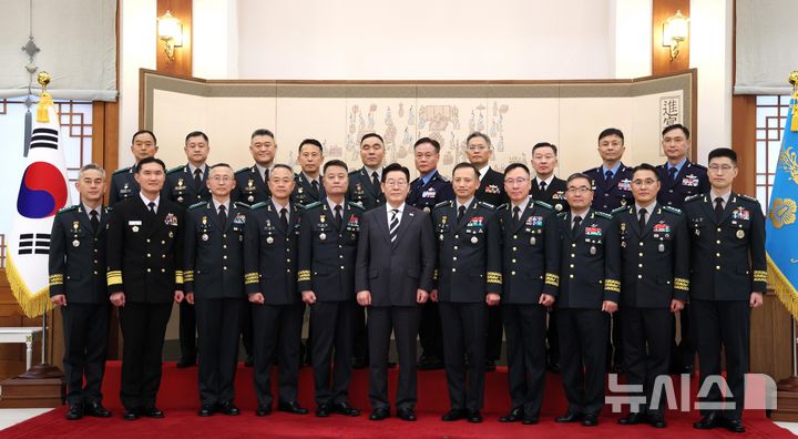 [서울=뉴시스]고범준 조재완 기자 = 이재명 대통령은 16일 중장 진급자 20명으로부터 보직 신고를 받고 삼정검 수치를 수여했다.