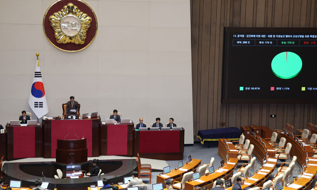 국회는 이날 오후 본회의에서 더불어민주당이 발의한 ‘윤석열·김건희에 의한 내란·외환 및 국정농단 행위의 진상 규명을 위한 특검 임명 등에 관한 법률안’을 재석 174인 중 찬성 172표, 반대 2표로 가결했다. 국민의힘은 표결에 불참했고 개혁신당 천하람 원내대표와 이주영 의원이 반대표를 던졌다.