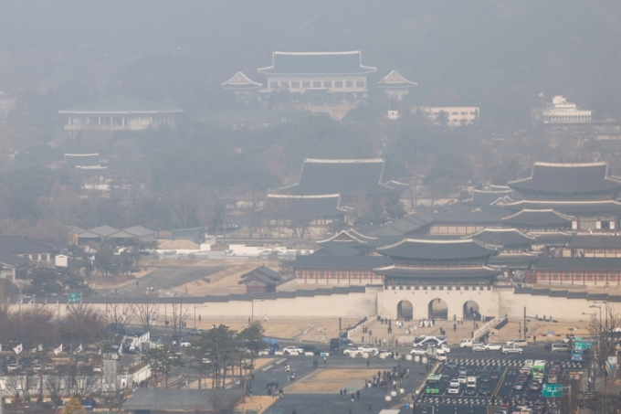올해 들어 처음으로 서울에 미세먼지 주의보가 발령된 16일 서울 종로구 광화문광장, 경복궁, 청와대 일대가 뿌옇다./사진=뉴스1 |
